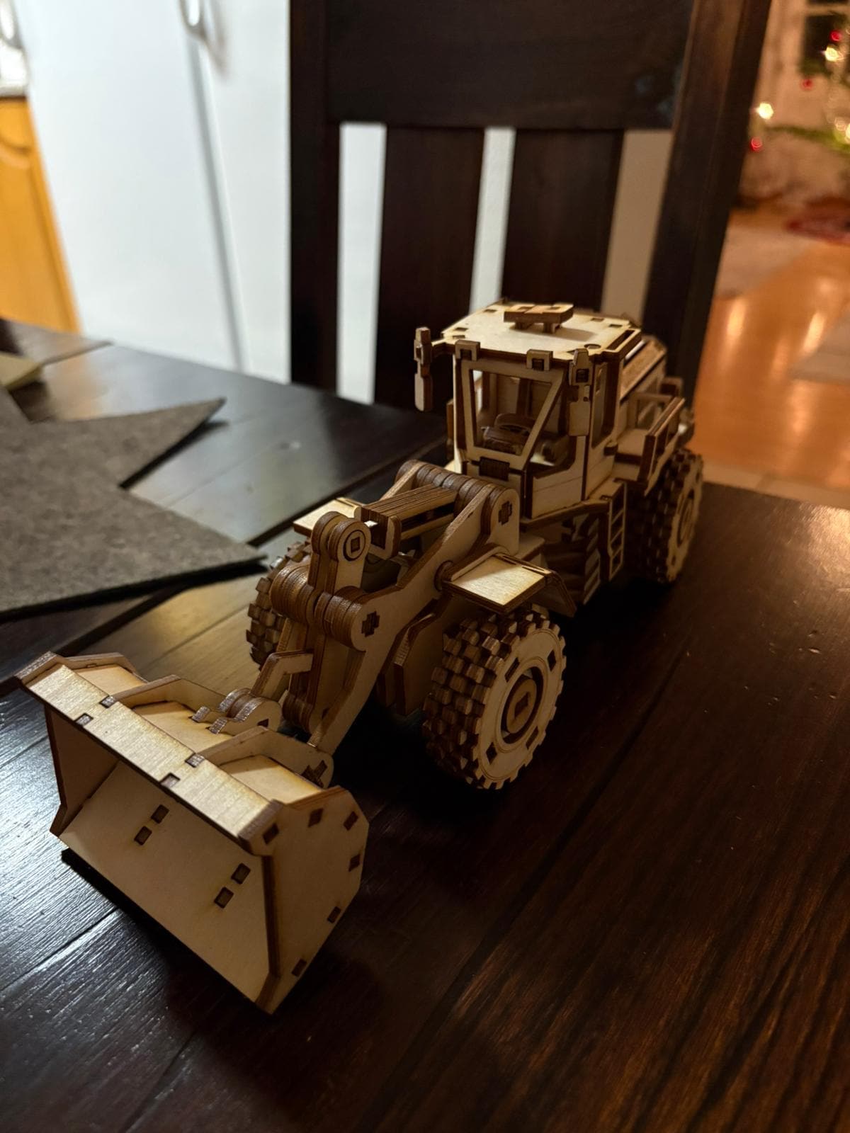 Build your own detailed front loader with this advanced 3D wooden model for laser cutting. This digital file is perfect for experienced makers looking for a challenging and rewarding project. The model features realistic working parts — the bucket lifts and tilts, the wheels rotate, the body turns, and the cab door opens. Designed at approximately 1:35 scale, it's a striking piece for display or collection.